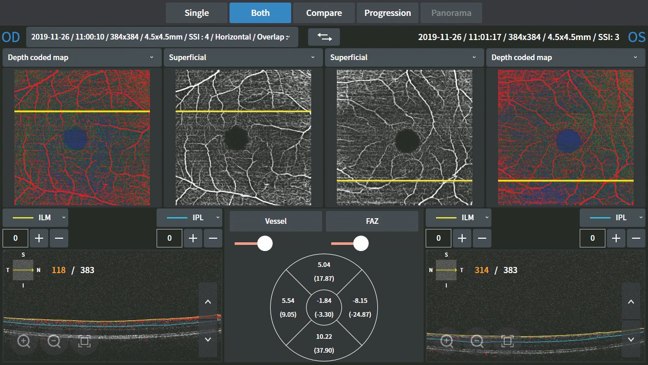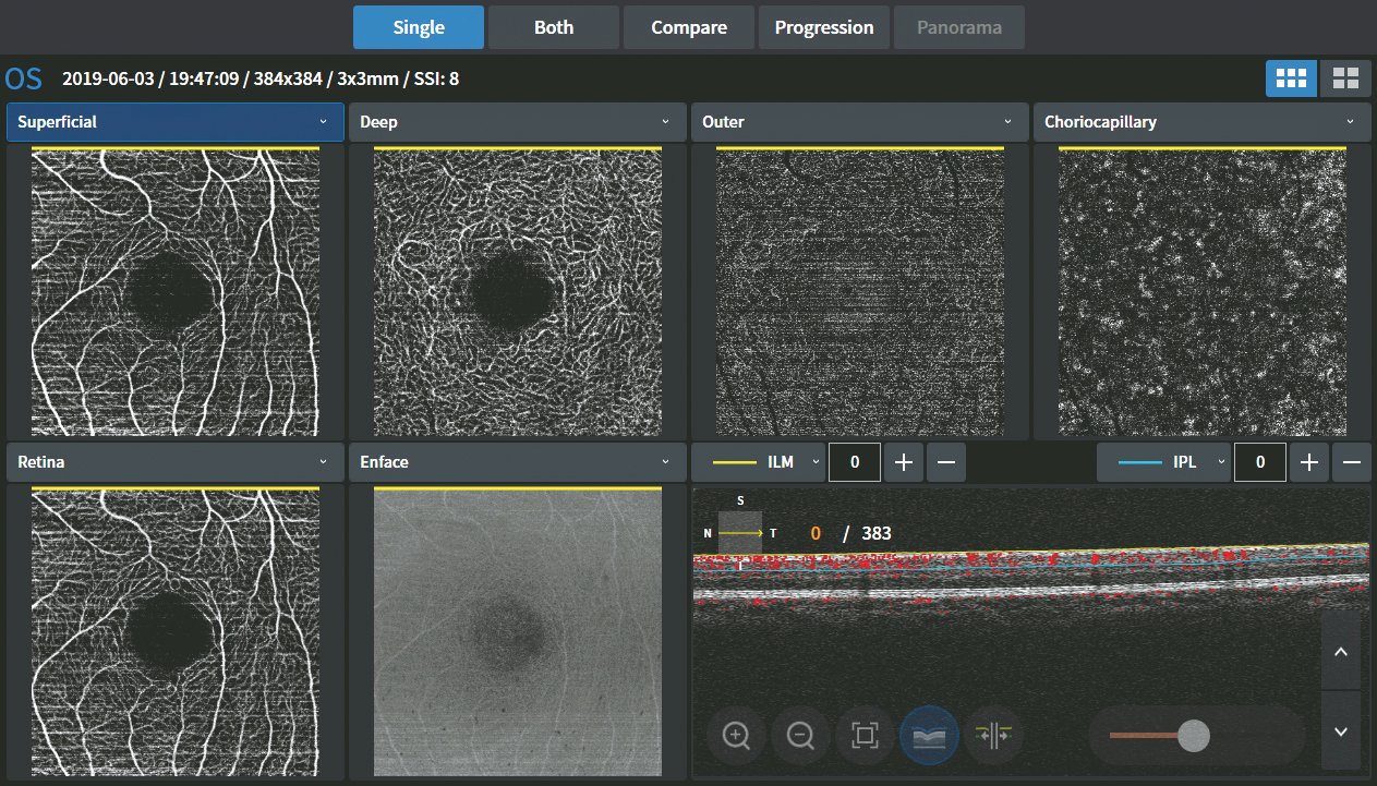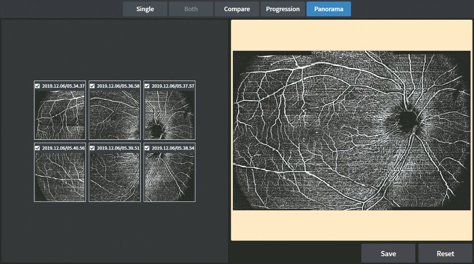 Die Webviewer PC-Software ermöglicht dem Benutzer beispielsweise einen Modus zur Progression und einen Vergleichsmodus, um das Gefäßnetz schichtweise im Detail zu überprüfen. Durch die Anzeige der Schichten in verschiedenen Farben ist es einfach, die Pathologie einer Auffälligkeit  zu erkennen und zu verstehen.