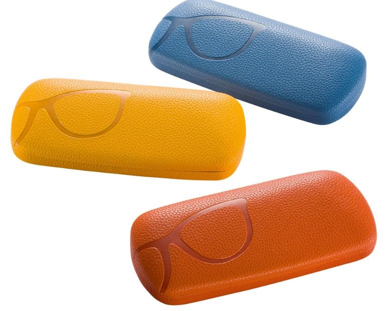 Metalletui mit Scharnier, Bezug mit geprägter Brille, dunkelgraues Innenfutter