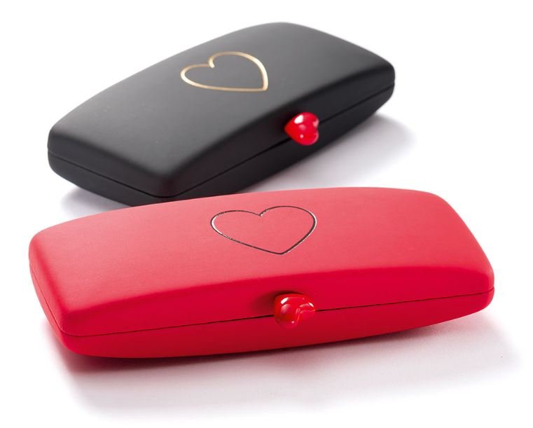 Metalletui mit Scharnier, mit geprägtem Herzmotiv, mit verschraubter Herzapplikation, schwarzes Innenfutter